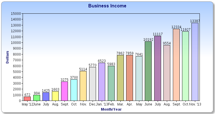 In November of 2013, I made $13,387 in business income, before expenses. I’m hoping for a similar level or higher this month.