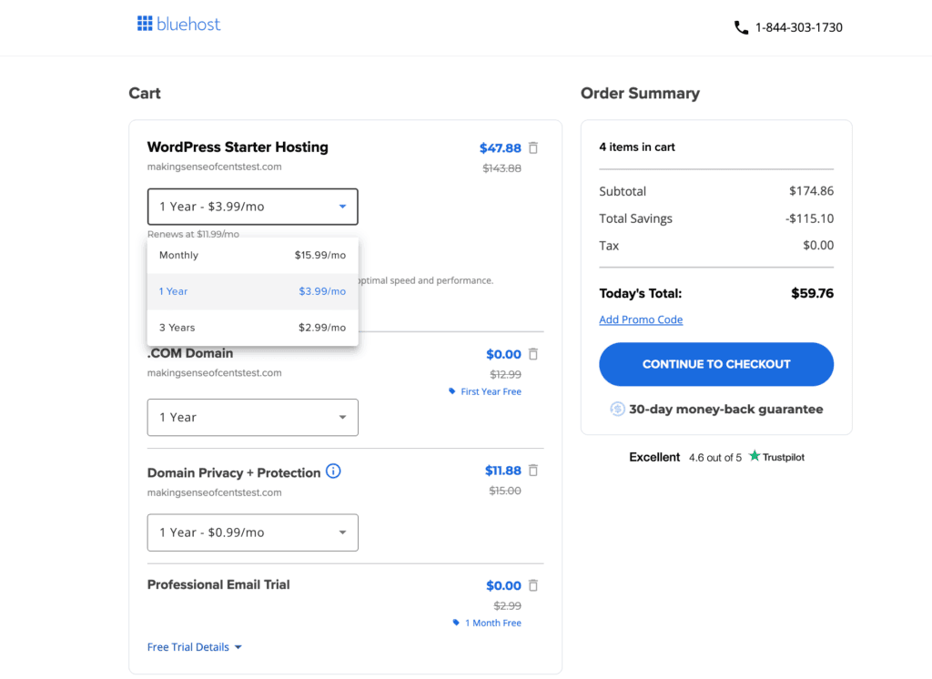 - Other than the above, you do not need the other items that Bluehost sells, so I would uncheck any of the extras that are listed.