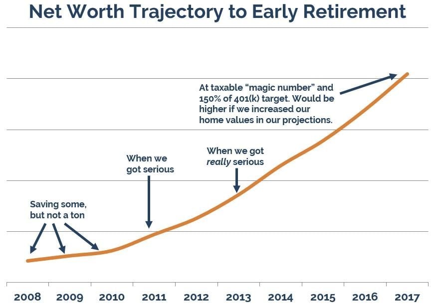 3. Not inflating our lifestyle. For the last decade of our careers, we banked every bonus and every raise. So at the start of each year, we’d increase our automatic investments by at least as much as our paychecks increased, meaning we never felt like we got a raise, and we didn’t start spending more. When you add the compounding effect of all those raises we banked, it adds up to quite a big number! But for us, because we did it gradually that way and just kept the amount we had to spend steady, it never felt like a sacrifice to save at a really high rate.