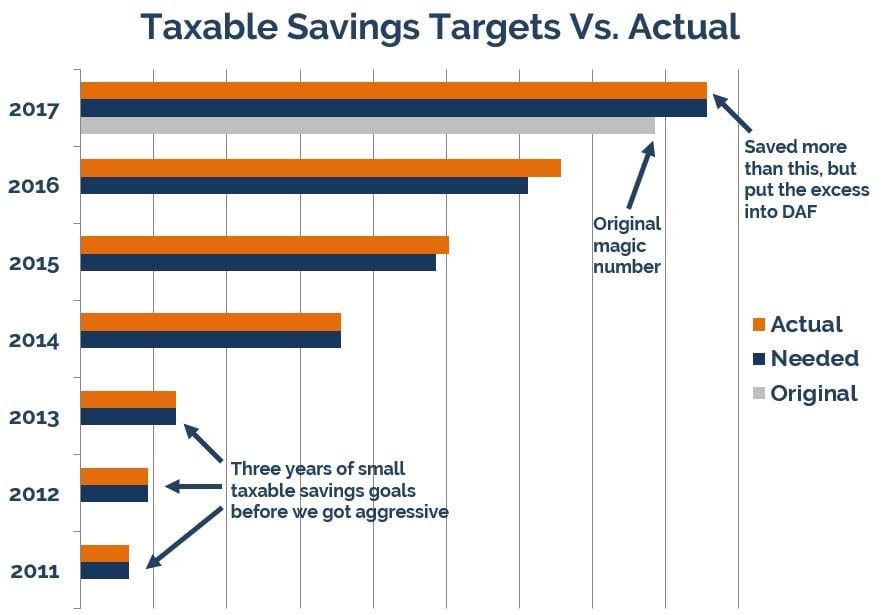 We probably overcomplicated our calculations a bit because we’re both spreadsheet nerds, but the short version is that we calculated that our 401(k)s already had enough in them to support our “phase 2” (basically our traditional retirement, from age 59 ½ onward, after we can access our 401(k) money without having to jump through any hoops), and so we focused on saving an amount in unrestricted, taxable mutual funds that our spreadsheets told us would carry us through the first 18 years (our “phase 1”). We based those projections on extremely conservative market gains – only about percent real returns after inflation – so that we’d be okay even if the markets are flat for many years.