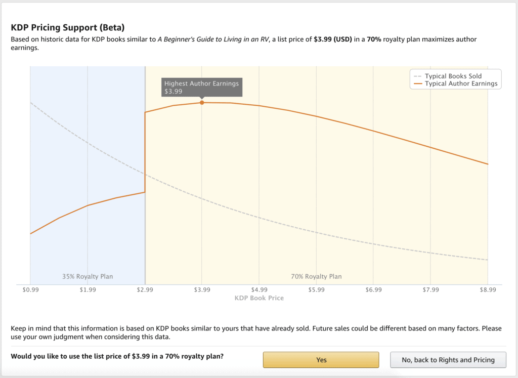 If you choose to self-publish with Amazon, pricing ebooks is easy. In addition to automatically being restricted to a $2.99-$9.99 price range set on your ebook (the price range is a lot more loose with paperbacks), Amazon offers Kindle Pricing Support. It’s in beta right now, but when you view the service, it tells you exactly what prices other books in your categories are selling the most copies at.