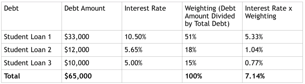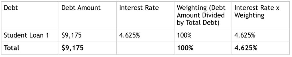 My second step in my debt repayment strategy was to create a table of the weighted average cost of debt.