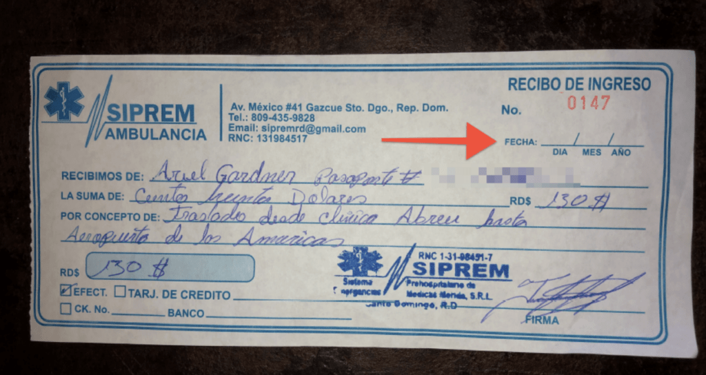The ambulance ride to the airport was 7,600 DOP or $130. We paid the drivers in cash plus a tip. They were amazing, by the way. Neither of them spoke English and we don’t speak Spanish, so we spent the 30 minute drive communicating via Google Translate.