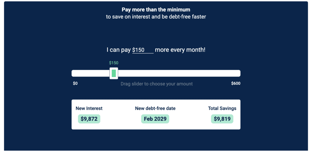 This debt payoff calculator is easy to use and it will show you how long it’ll take you to pay off your debt at your current rate as well as the amount of interest you will pay, how changing the monthly amount you pay will impact your debt payoff plan, and more.