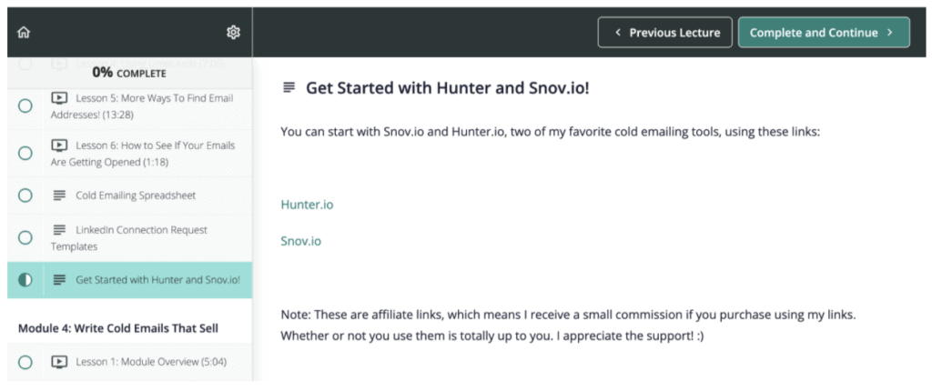 This makes it easy to naturally share some of my absolute favorite cold emailing tools (and their affiliate links) within the course in a dedicated section, like this: