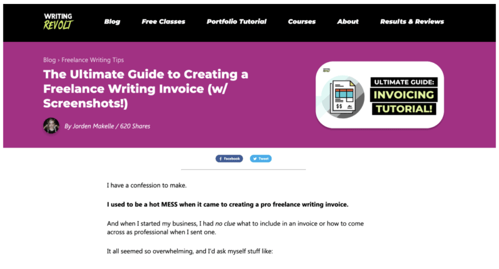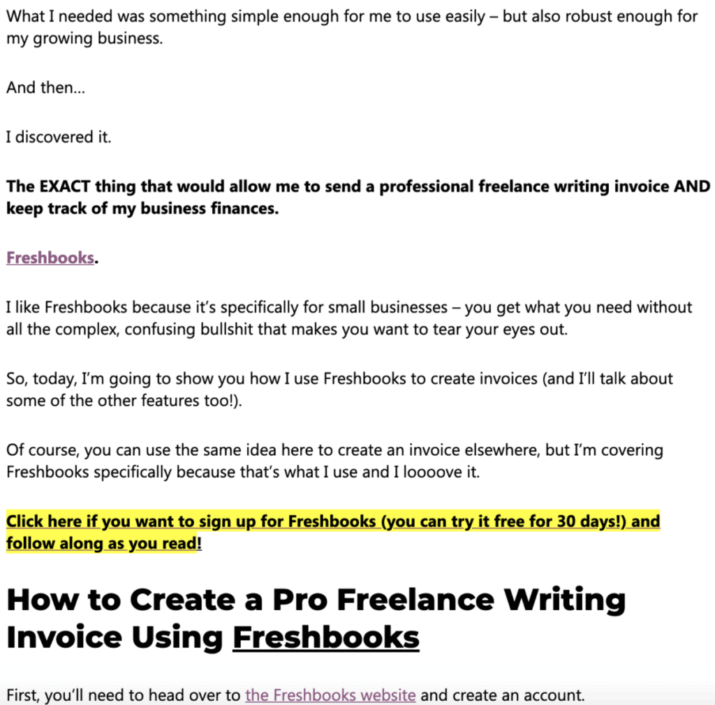 I’ve used the same approach promoting my affiliate link for Freshbooks, the invoicing software I enjoy, by sharing it inside of a freelance writing invoice tutorial.