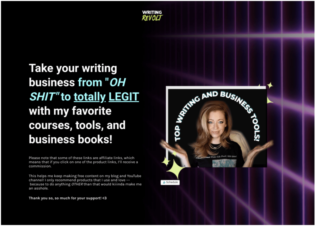 More recently, I created a dedicated landing page with my favorite writing and business products/books (and their affiliate links) all in one place for easy reference.