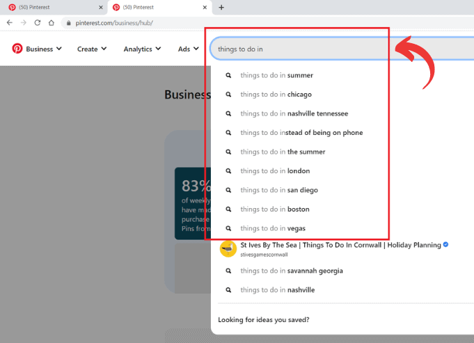 If you’re a travel blogger, you can type something like “things to do in…” and you’ll see the following suggestions from Pinterest.