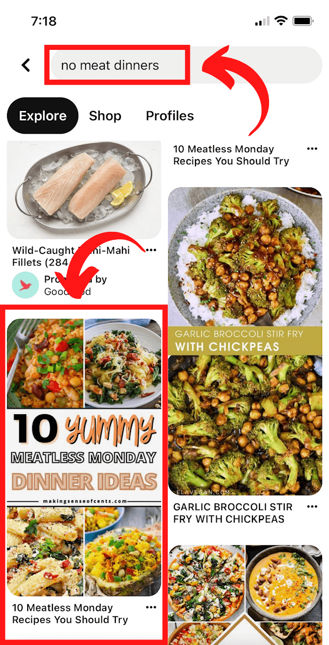 When I was searching for “meatless dinner ideas” or “no meat dinners” on mobile, this Pin that Michelle used from the Pin Savvy Templates bundle showed up on the top searches on Pinterest. Michelle is ranking quite high on Pinterest with these related keywords about meatless meals on the platform as you can see in the screenshot: