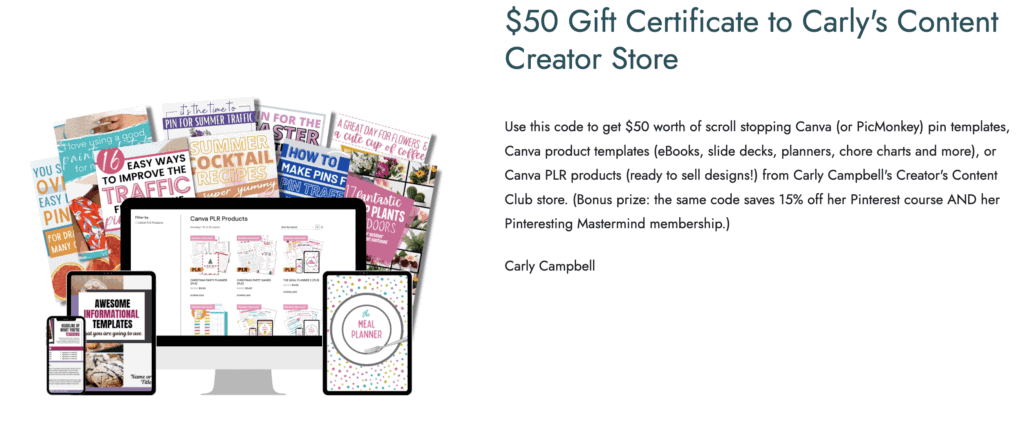 - $50 Gift Certificate to Carly’s Content Creator Store